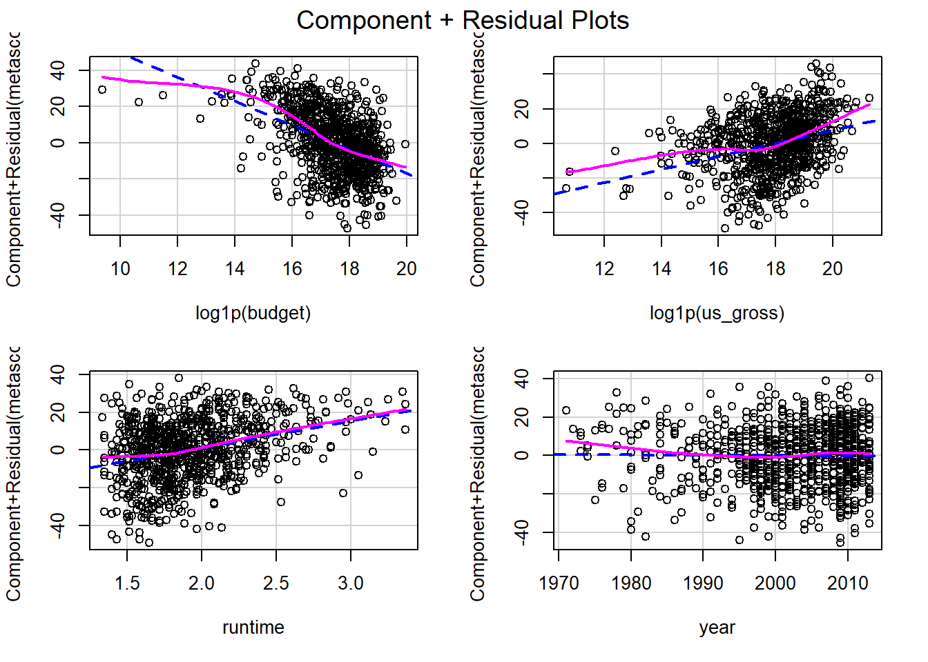 #>   lm(formula = metascore ~ log1p(budget) + log1p(us_gross) + runtime +      year, data = movies_small) :
