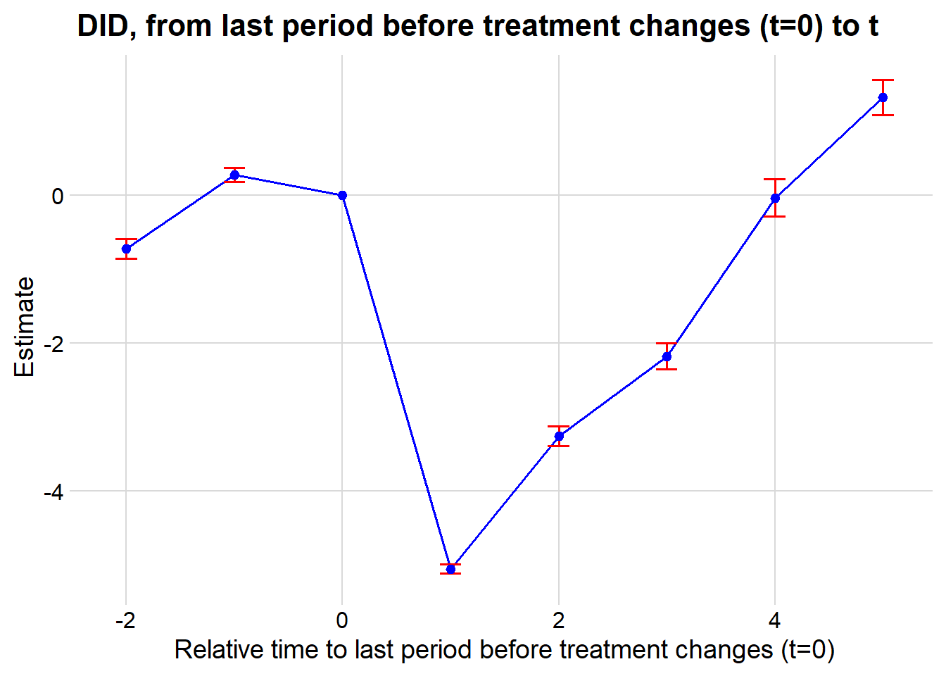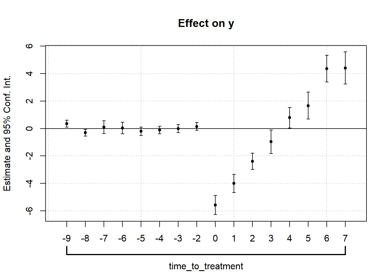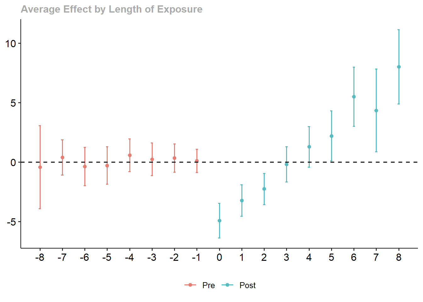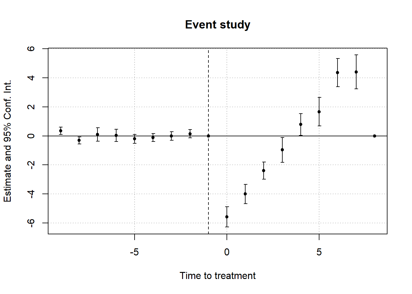 A more focused diagnostic is to plot the average outcome in event time (years relative to first treatment) (Figure 30.4).