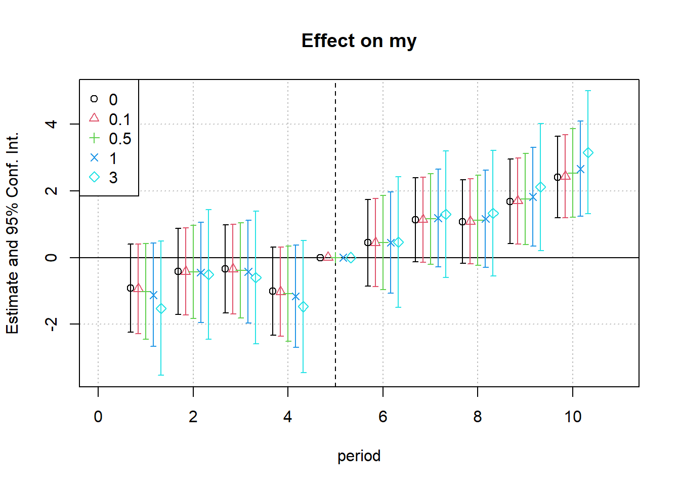 #> Signif. codes: 0 '***' 0.001 '**' 0.01 '*' 0.05 '.' 0.1 ' ' 1We have the dynamic treatment effects for different hypothesized extensive-margin value of \(x \in (0, .1, .5, 1, 3, 5)\)