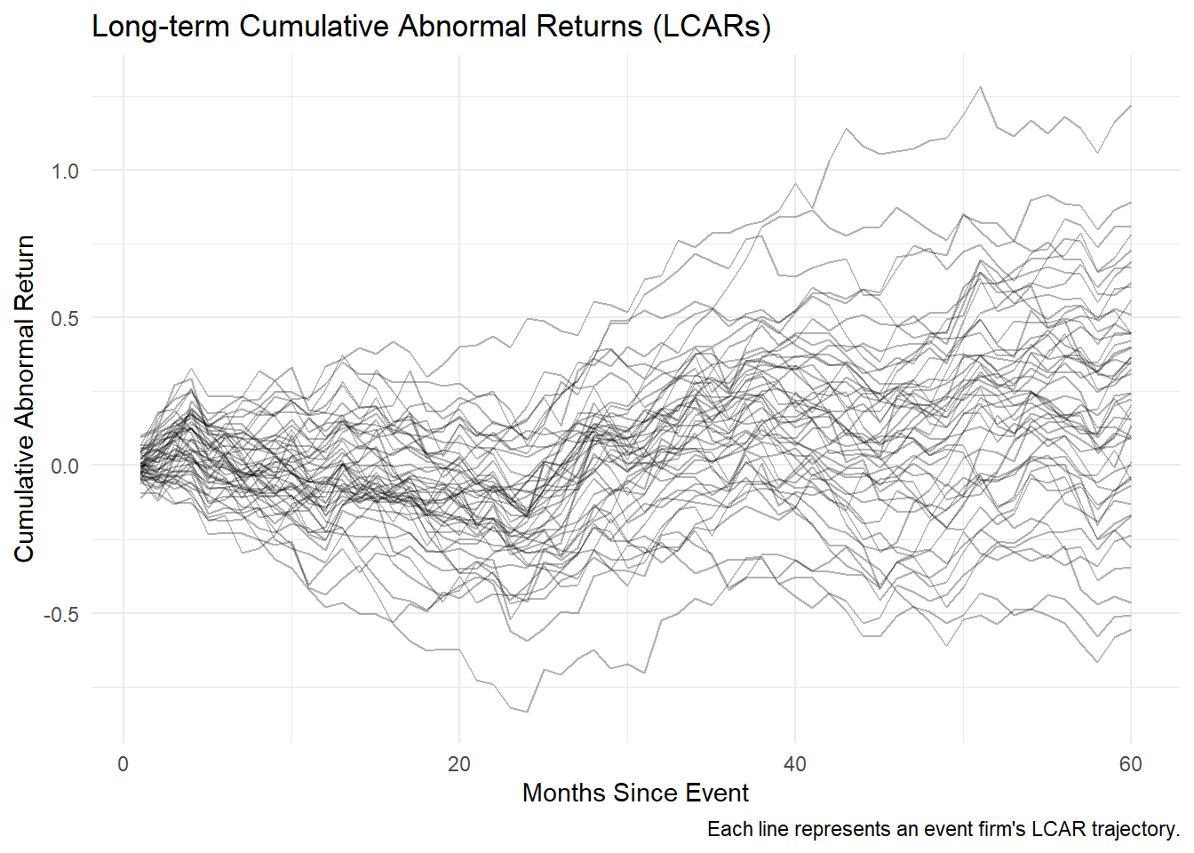 - Since it has the stock-specific abnormal returns, we can do regression on CARs later. But it only gives market-adjusted model. However, according to (A. Sorescu, Warren, and Ertekin 2017), they advocate for the use of market-adjusted model for the short-term only, and reserve the FF4 for the longer-term event studies using monthly daily.